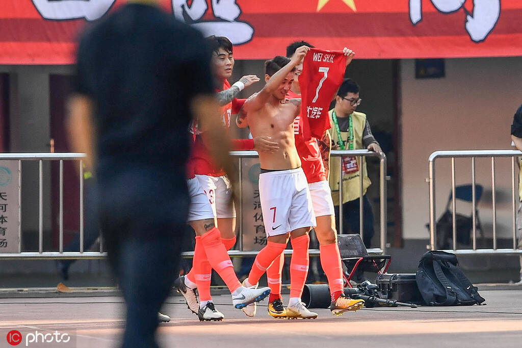 2019中超收官战,恒大3-0击败申花夺冠,这是恒大队史第8个中超冠军,也追平了中超历史纪录。上半场韦世豪打破僵局后,脱衣庆祝致敬C罗。
