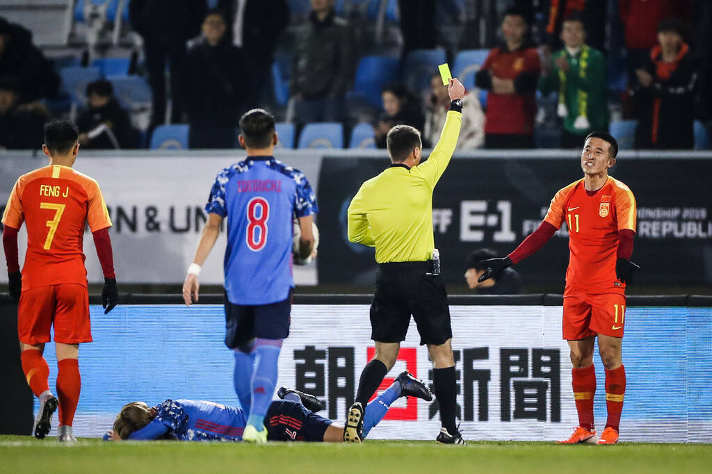 东亚杯-中国男足1-2不敌日本迎开门黑,董学升头球破门,姜至鹏飞踹日本球员染黄。