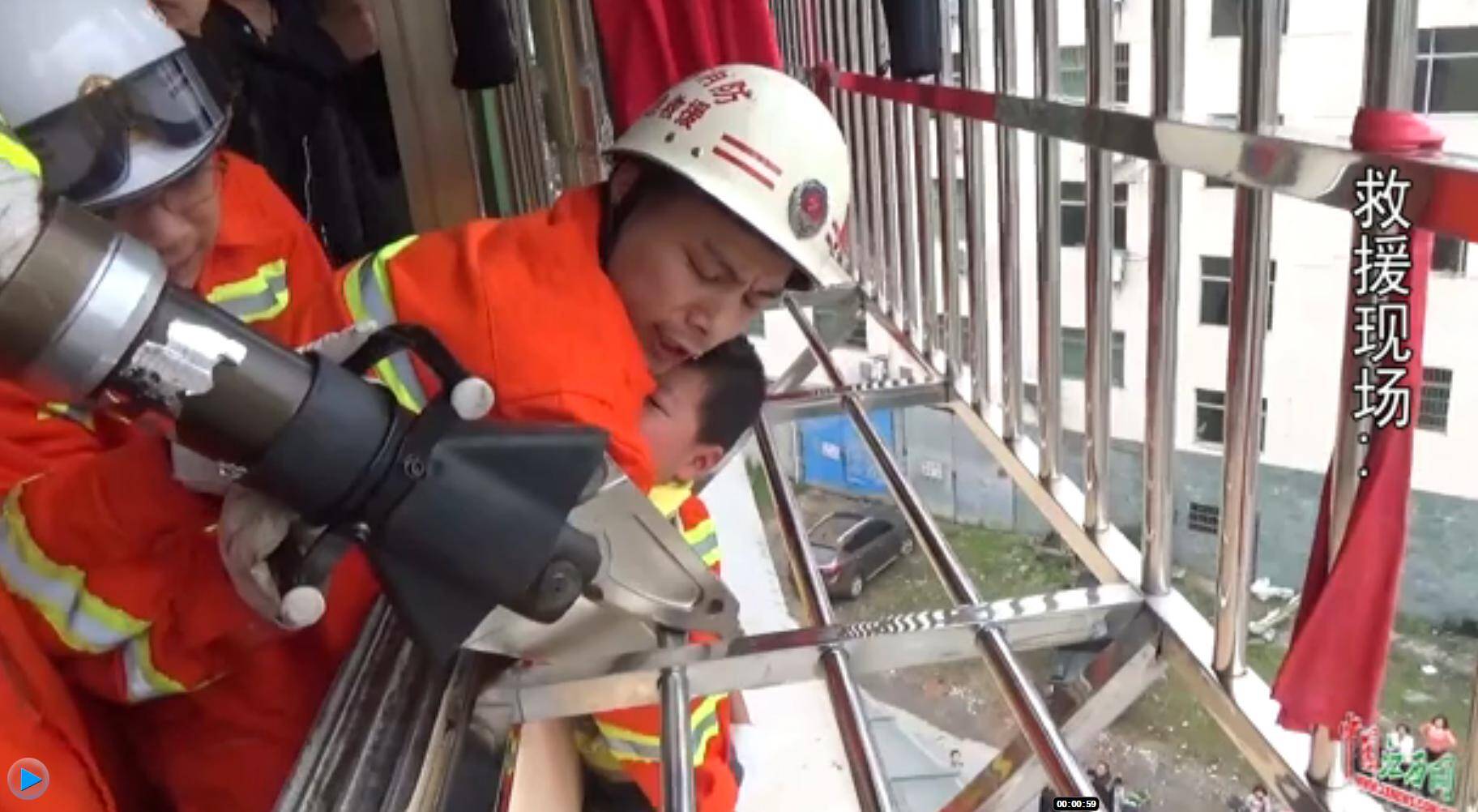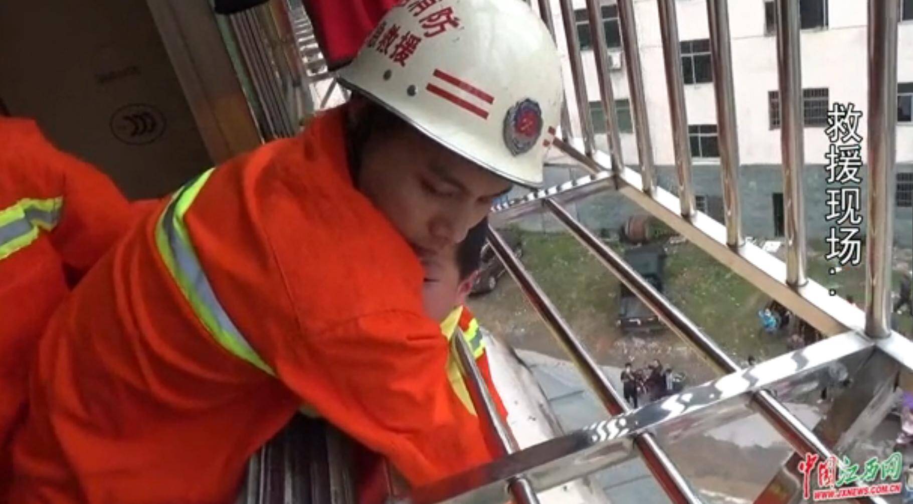 5月10日下午,江西鹰潭余江县一小区内一名男童头部被卡在四楼防盗窗内,身体悬空。所幸的是消防官兵及时赶到现场进行救援,孩子被成功救出。