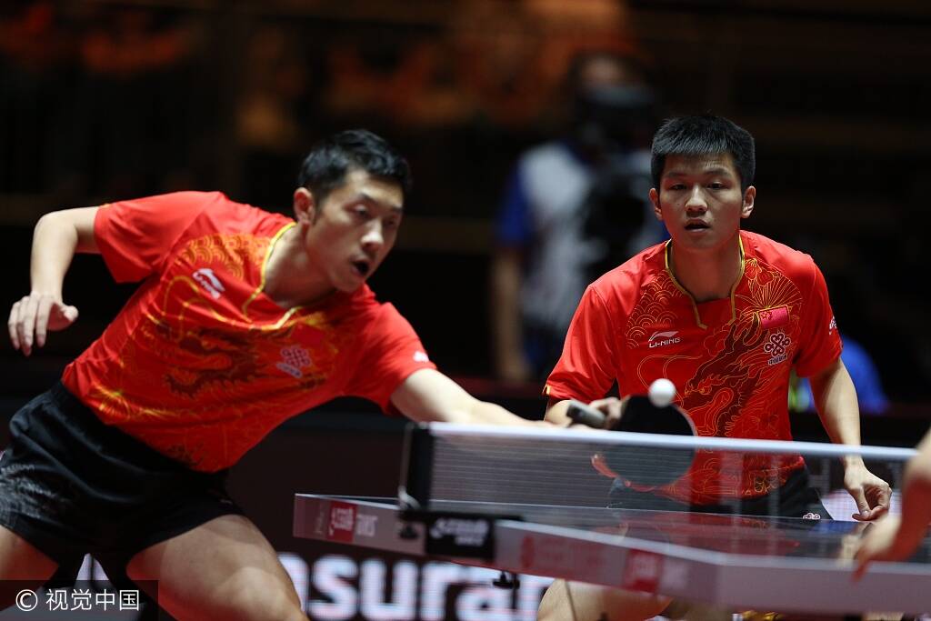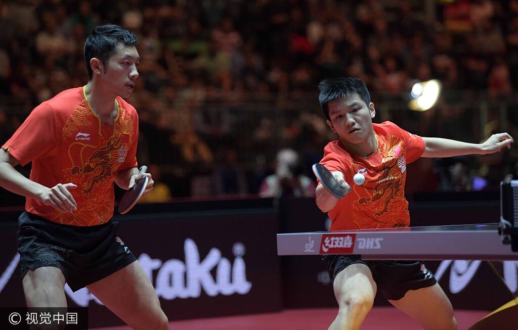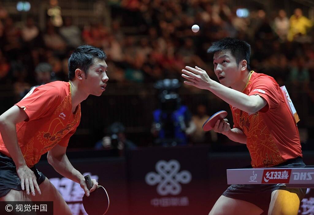 德国杜塞尔多夫世乒赛男双决赛,在中国组合樊振东/许昕与日本组合森园政崇/大岛祐哉之间进行,樊振东/许昕最终4-1(11-9、16-14、11-9、6-11、13-11)战胜这对日本组合夺冠。许昕曾在2011年鹿特丹世乒赛上与马龙搭档夺冠,两年前还与张继科搭档夺冠,这次是许昕第三度世乒赛男双捧杯。