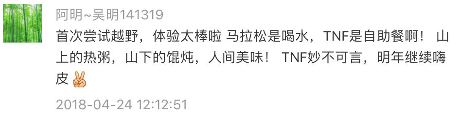 我们与近5000名跑者共同完成了这场比赛,在后台收到的留言中,超过三分之一的选手表示,对TNF100这场愉快的首野之旅表达了谢意。